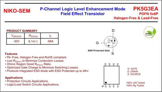 PK5G3EA is a low RDS(ON), P channel MOSFET, especially for Load Switch circuit or Protection circuit applications.
