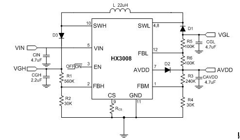 HX3008是一款用于小型薄膜晶体管液晶显示屏 (TFT-LCD)的完整功率转换器。该器件可采用单节锂离子电池或任何在2.5V 至5.5V 之间的电压源来供电,在单个电感作用下可分别产生正负电压输出。其中,主输出可调节电压AVDD为LCD提供低噪声的源端驱动电压,而辅助输出可调节电压VGH和VGL则为LCD提供栅端驱动电压。HX3008内部集成了一个峰值电流可变的PWM控制器,巧妙的通过时分复用来保持输出电压在负载范围内稳定,这种结构尽可能的提高了总的转换效率,简化了外围应用电路。HX3008内部还包括一系列的保护电路,如软启动,热保护和逐周期过流保护。