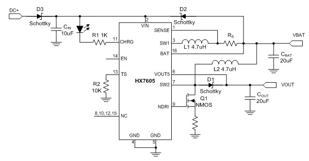 HX7605是一款具有高效率升压型开关稳压器的电池充电器。该器件非常适合于给那些需要多个电源轨、基于单节锂离子/锂聚合物电池的手持式应用供电。