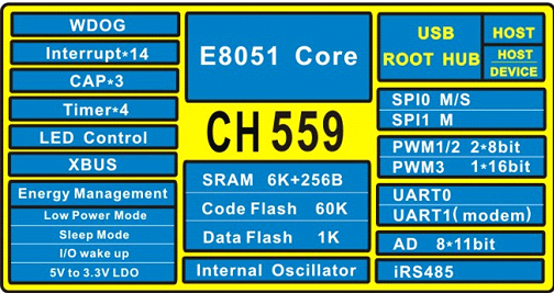 CH559 内嵌USB控制器和双USB收发器,支持 USB-Host 主机模式和 USB-Device 设备模式,支持 USB 2.0 全速 12Mbps 或者低速 1.5Mbps,USB 主机模式下可以通过双端口 Root-HUB 同时管理两个 USB 设备。支持最大 64 字节数据包,内置 FIFO,支持 DMA。
