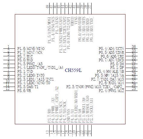 CH559提供丰富的接口资源,包括内置类485数据收发器、LED控制卡接口和快速电平捕捉功能,其他包括2组SPI、2路串口、8位并口等,UART1兼容16C550;内置4组定时器;提供1路16位PWM和2路8位PWM;支持8通道10/11位ADC。