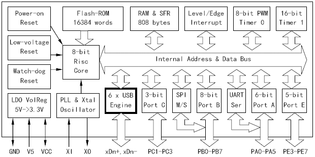 > CH537X内置4通道独立USB设备控制器,通过内置HUB,每组各支持3个USB功能设备。